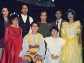 ![]() 「「劇団シンデレラ」 という演劇団に 所属していました。 中央が岡田。 | ![]() 子供向けから社会人向け まで、色々な演芸を していました。 前列中央が岡田。 |