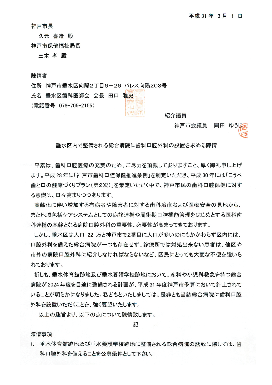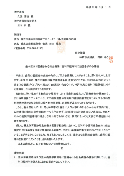折しも、垂水体育館跡地及び垂水養護学校跡地において、産科や小児科救急を持つ総合病院が2024年度開院目途で整備される計画が、平成31年度予算において計上されました。この千載一遇の貴重な機会に、当該総合病院に歯科口腔外科機能をも備えていただくことを、強く要望申し入れました。