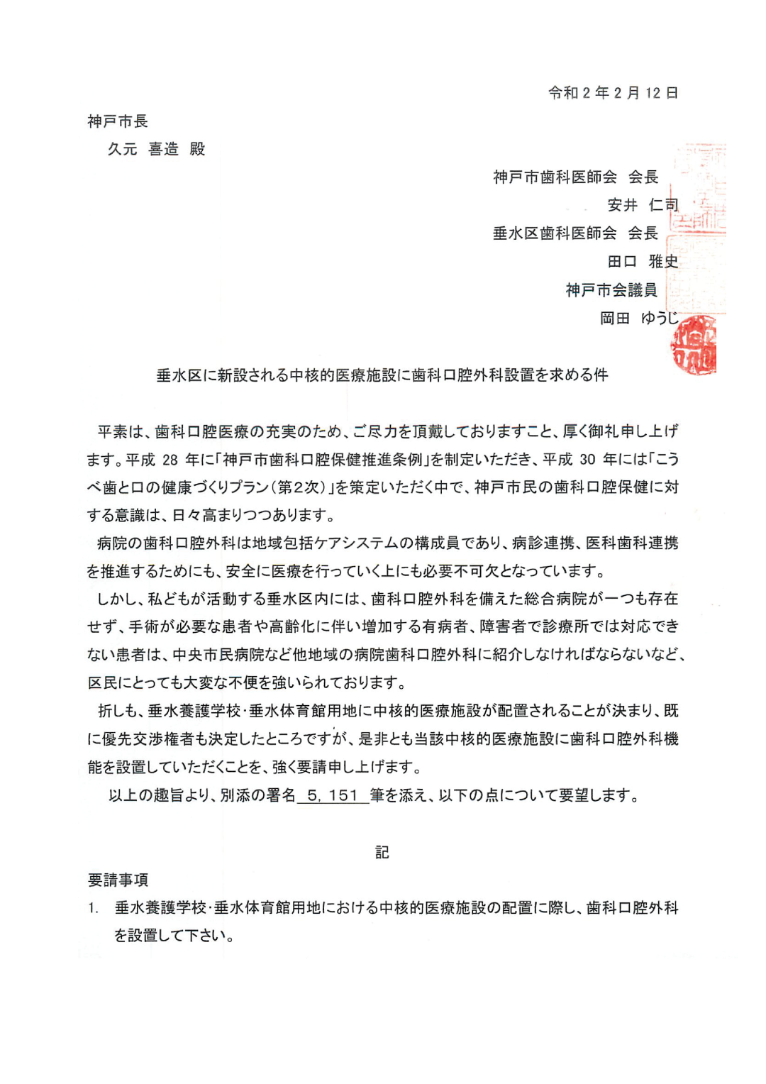 市の歯科医師会と区の歯科医師会の両会長と共に、商大筋の新病院に歯科口腔外科を設置するよう求める要望署名 5,151筆 を副市長に提出。