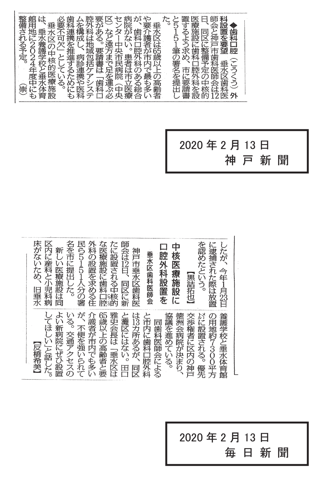 垂水区は22万人都市でありながら、三重苦、すなわち3つの診療科の空白地帯で、小児科救急、産科、そして歯科口腔外科がありません。区民は緊急事態の際には、遠く中央市民病院など、他区に行かなければ治療が受けられません。