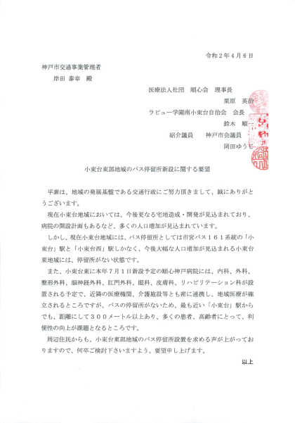 その中でも喫緊の課題であった小束台東部へのバス停新設について、小束台自治会の会長以下役員の皆様、順心神戸病院の理事長他、関係者の皆様の総意として、当局に要望書を提出させていただきました。