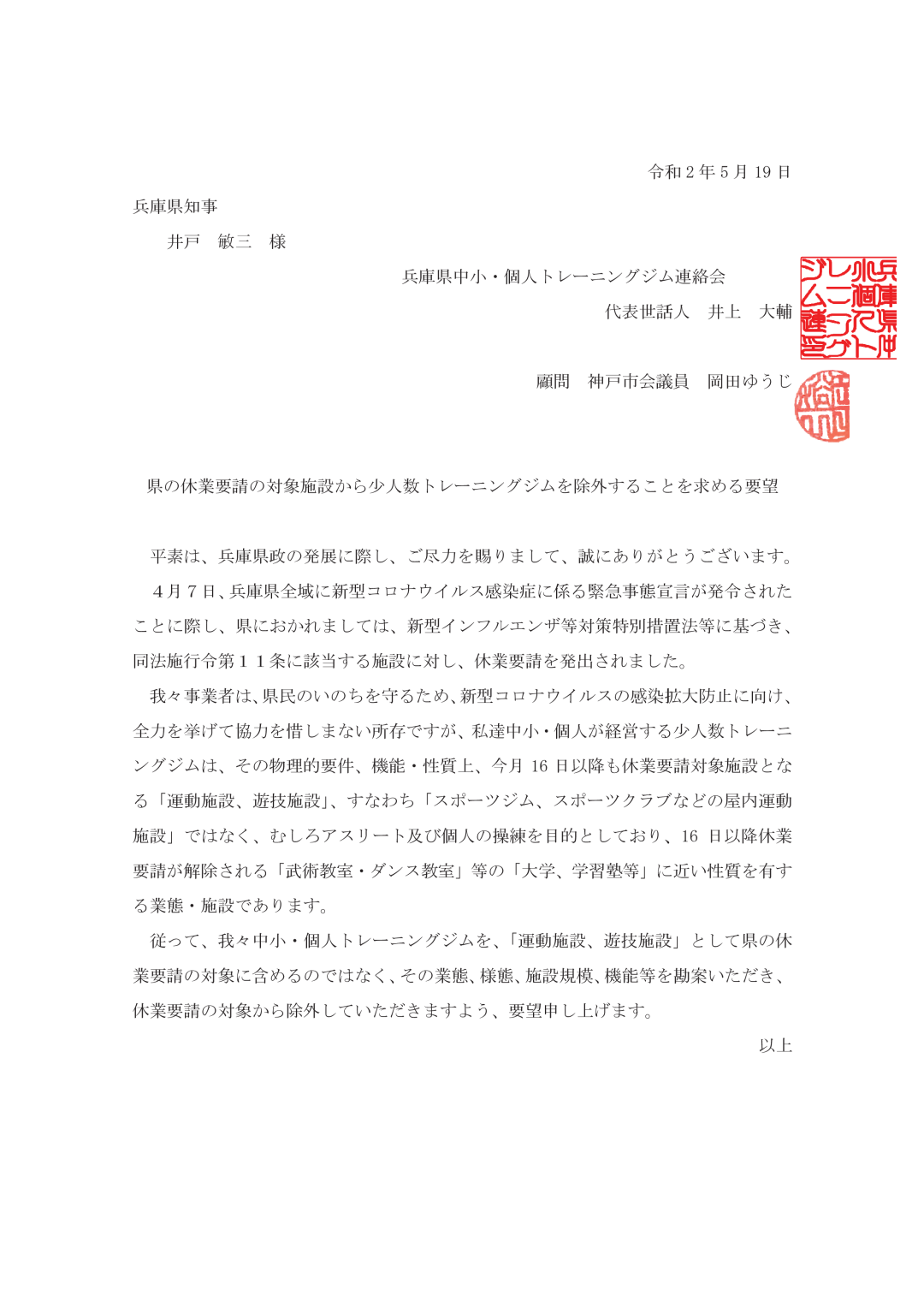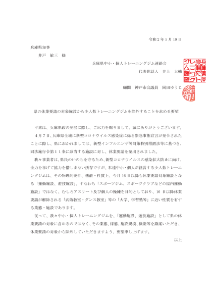 休業対象施設から少人数トレーニングジムを外す要望