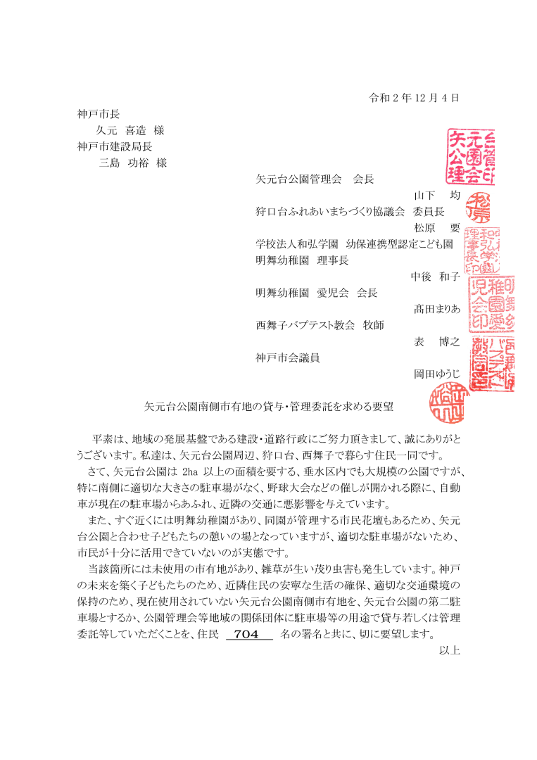 十年以上もの間、この地域の懸案でしたが、矢元台公園の管理会長、ふれまち委員長、明舞幼稚園理事長・保護者会長、教会牧師、そして私が力を合わせ、矢元台公園南に放置されている市有地を、市民が使える駐車場等に転換してもらおうと、署名活動が行われ、1か月で 704筆 の署名が集まりました。