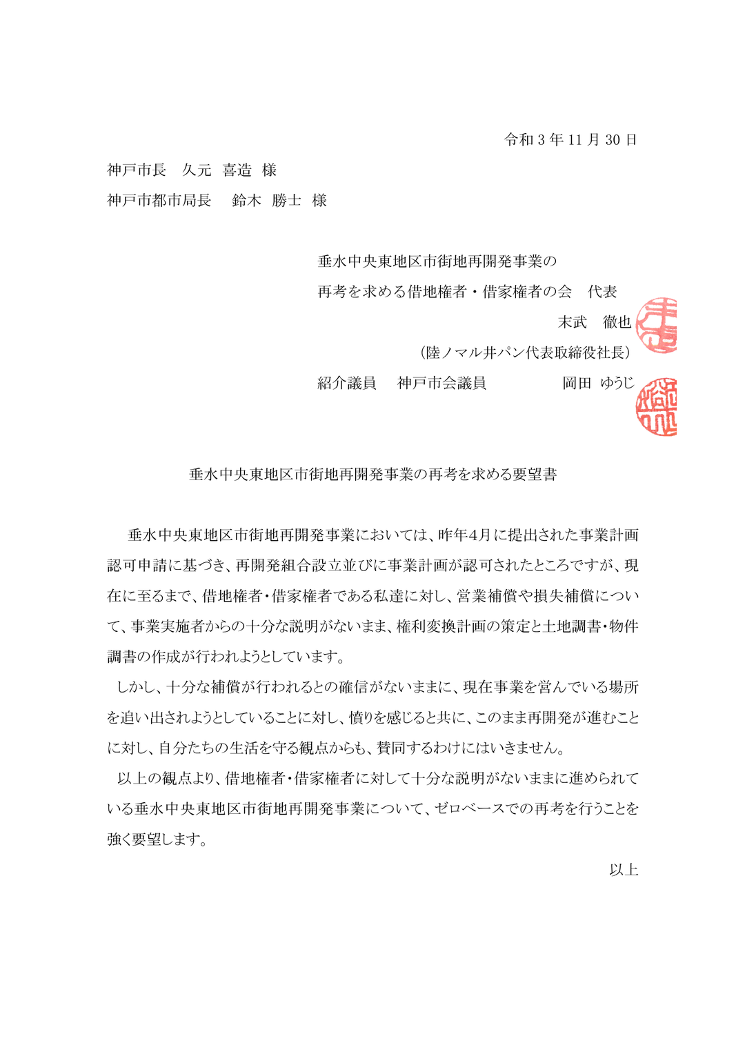 廉売市場再開発の説明を求める要望(2021年11月30日)