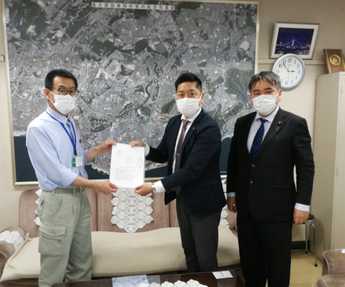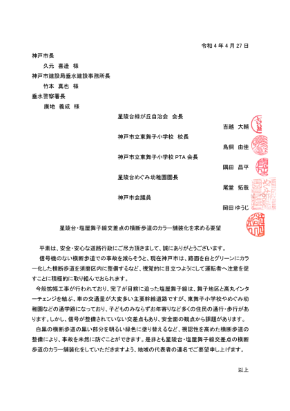 自治会や幼稚園・小学校関係者ら地域関係者の連名で、星陵台舞子坂線の横断歩道の「カラー舗装化」を求める要望をとりまとめ、代表して東舞子小PTAの隅田会長と共に、垂水建設事務所長に提出しました。