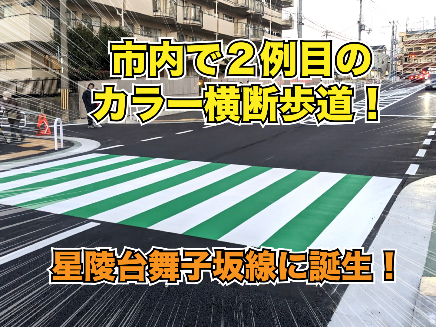 交通量が多いものの信号のない、通学路でもある交差点の安全確保をしてほしいとの関係者の皆様の要望が実り、2022年内に工事が終了。【市内で2例目の『カラー横断歩道』】が星陵台舞子坂線に誕生することになりました。建設事務所他、関係各位のご尽力に深く感謝申し上げます。