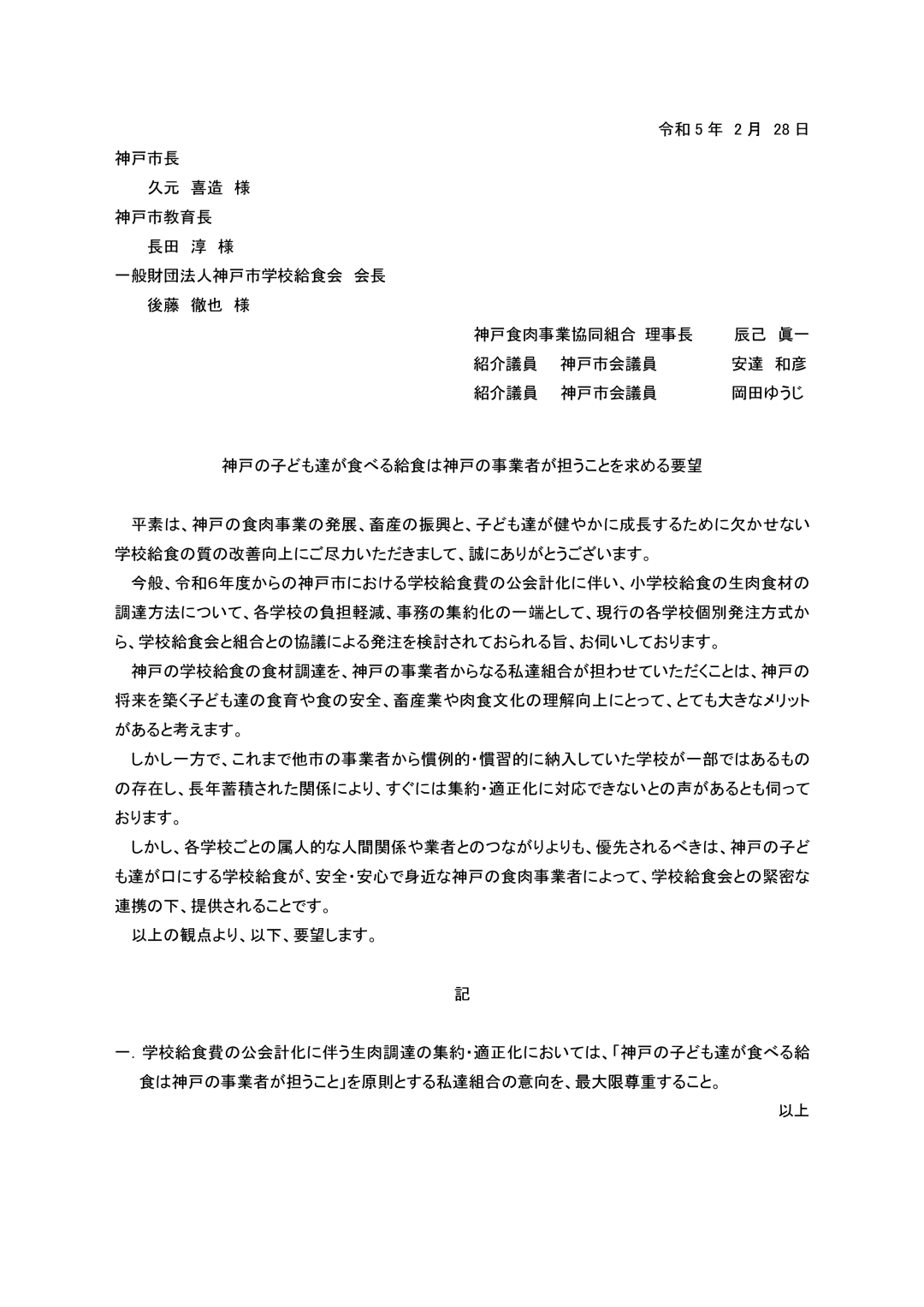 神戸の給食は神戸の事業者が担うことを求める要望