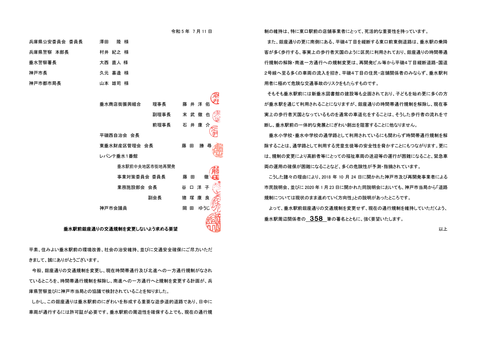 垂水商店街振興組合、レバンテ、平磯自治会など沿線・周辺住民の皆様が「358筆」の署名を集めて反対。垂水警察署長、市都市局幹部に提出&直談判を行いました。