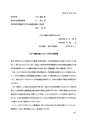 UNITYで行われている市民講座は評判がよく、大勢の受講生が講座の存続を求めており、2023年10月30日に、講座の存続を求める受講生1,111筆の署名が神戸市企画調整局長宛、提出されました。