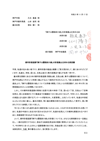 仲田・霞ヶ丘住民による都市計画道路「舞子公園福田川線」の廃案を求める要望活動が起こり、146筆の住民署名を垂水区長、垂水建設事務所長、都市局担当課長に手交しました。昭和32年に成立したものの、70年以上眠っていた道路計画が数年前に急遽よみがえり、立ち退きを迫るなど人権侵害です。私からも当局に対し、丁寧な対応を強く要請させていただきました。